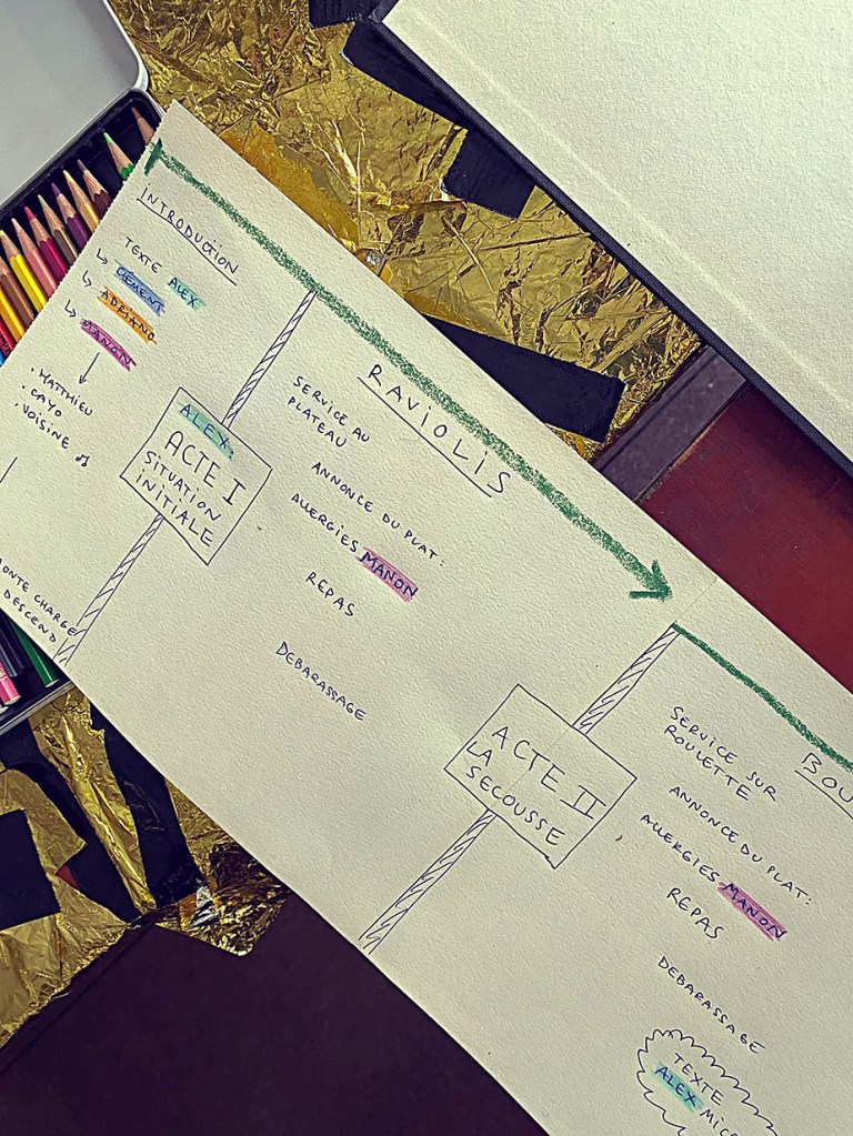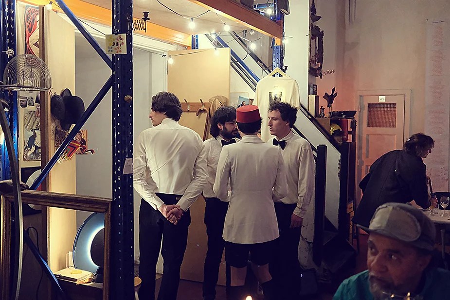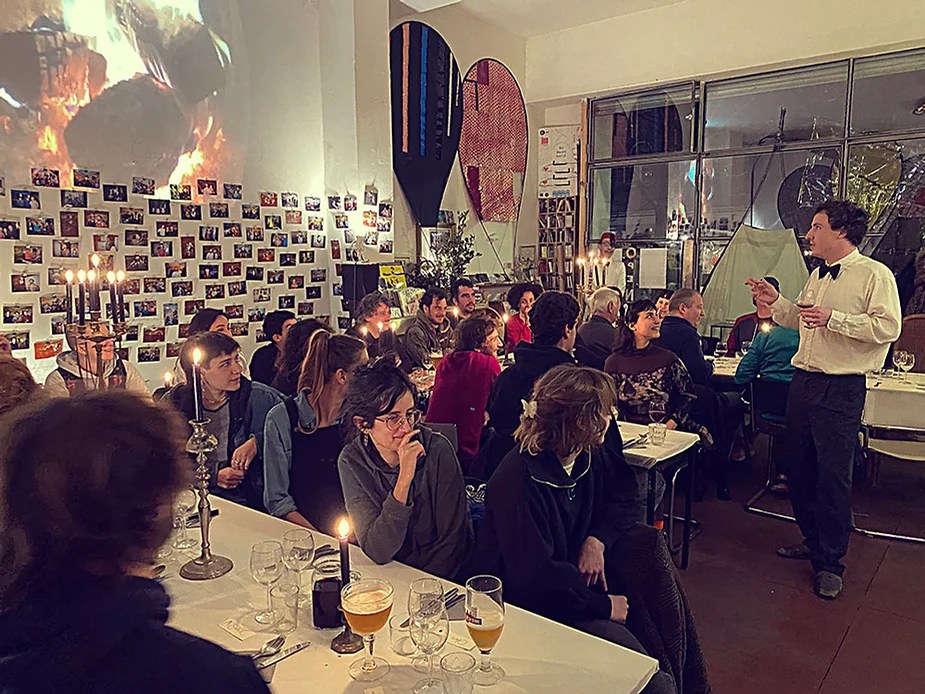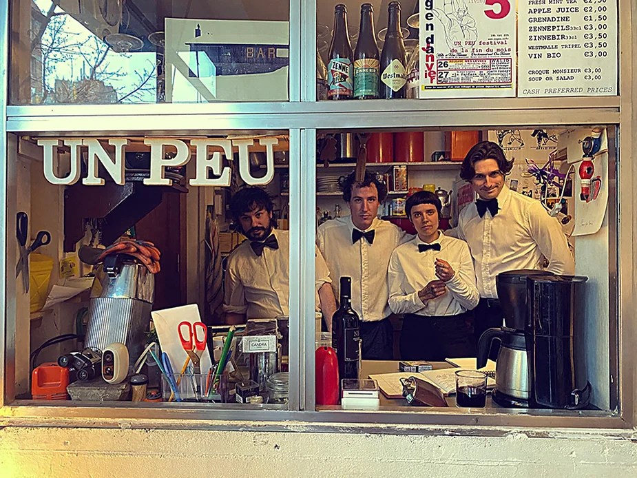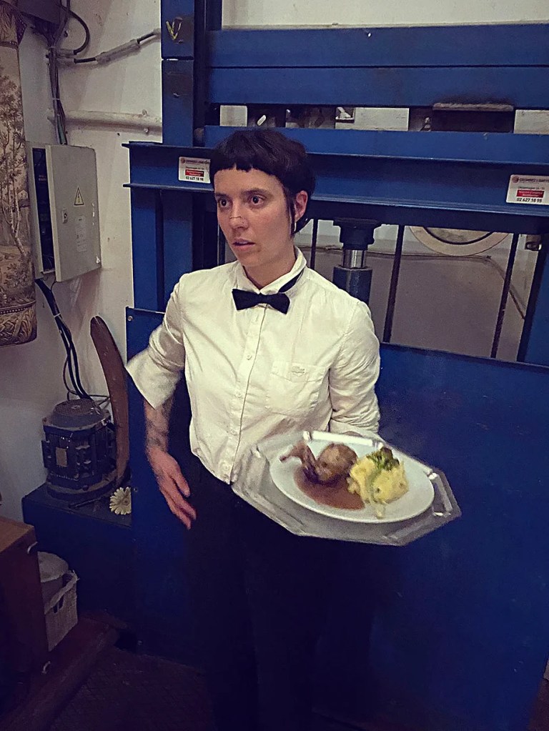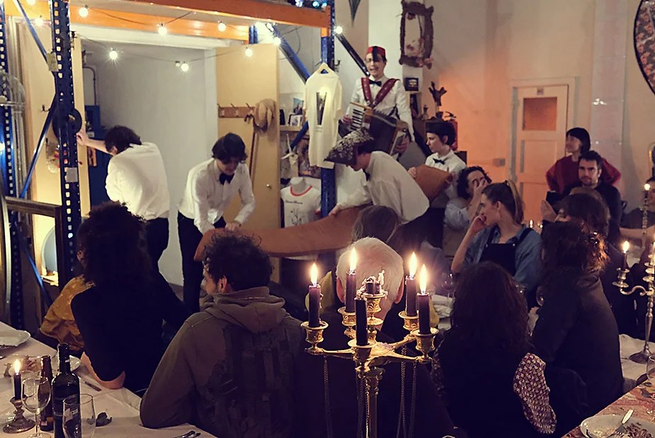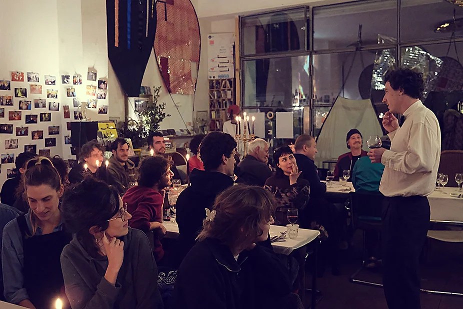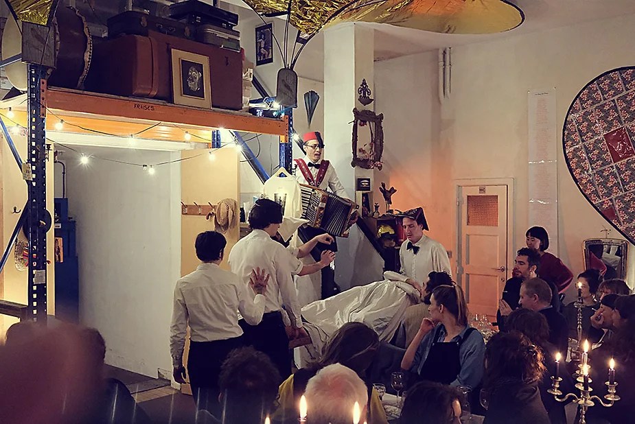 UN PEU de souvenirs d’un véritable mensonge avec l’ABONDANCE DES MYTHOS – présentée par le collectif bruxellois T(r)UELLE, au cours d’UN PEU FESTIVAL DE LA FIN DU MOIS – MARS – et lors de la cent septante septième des MILLE et UNE TERRASSE. C’était le VENDREDI SAINT. Le collectif T(r)uelle avait imaginé un banquet pour trente-trois couverts dans le CENTRE DE BEAUTE CULTURELLE UN PEU. La réception était composée de Quatre serveurs vêtus d’une chemise blanche et d’ un nœud papillon. Parmi eux il y avait les poètes comédiens, âgés d’ une trentaine d’ années : ALEX GUILLAUME, CLEMENT DELHOMME, MANON LAIGLE et ADRIANO LINZARINI. La cuisine était conduite par deux chefs Cuistots : l’éditeur underground Bichel et l’essayiste Edwin. Ils avaient alors investi la Terrasse sous terraine de façon à y élaborer leur menu en cinq services. Les haut-parleurs et la table de mixage de l’auditorium HD venaient de laisser la place à un grand frigidaire, une cuisinière au gaz, ainsi qu’un four. Le mobilier avait été déménagé, seul le grand sofa rouge était resté, mis à la disposition de la photographe Cayo van Breugel. Au cours du banquet elle invitera douze sujets en cuisine pour une séance de nu photographique. Enfin, il y avait la voisine qui était venue répéter son répertoire de musique classique sur le piano angélique. La musicienne japonaise jouait du Jean Sébastien Bach, tournant son dos à un régiment de trente-trois cailles qu’un couteau bien aiguisé venait d’en découper délicatement les têtes. A l’étage, dans la Terrasse intérieure, huit grandes tables formaient un E majuscule. Il y avait été dressée avec grand soin, tout un service orné. Des cartons nominatifs indiquaient la place respective de chaque convive. Tout ces effets avaient été méticuleusement Préparés de manière à faire croire aux hôtes – à la vérité de leurs mensonges, dans le plus étoilé des restaurants du royaume. Une heure avant le début du banquet, les deux chefs cuistots faisaient démarrer les fourneaux. La bataille des cuisiniers allait bientôt commencer, exactement quand une épaisse fumée de cuisson remplissait la Terrasse sous terraine … un peu trop abondamment. Aurait il été possible qu’un cumulus du huitième ciel de l’au de là, eût trouvé un passage dans ce cuisinage underground ? Les casseroles devenaient soudainement magiques, Edwin préparait une purée imprévue avec le moulin à purée de son grand-père. Bichel assurait l’artillerie lourde de sa batterie de couteaux. A l’ étage, les serveurs Alex Guillaume et Clément Delhomme accueillaient les trente trois convives de leurs boniments. Il était 19h30 au moment où Manon LAIGLE, serveuse de vérités, annonçait le premier acte : DES RAVIOLIS au fromage. Réalisée sur place, la pâte avait été colorée dans du jus de betteraves. Les plats étaient amenés à l’aide du monte-charge bleu. . Un peu plus tard, celui-ci remontait également Matthieu Ha, entrain de jouer de l’accordéon durant la lecture poétique d’Alex Guillaume, assis sur les marches de l’escalier menant à la mezzanine. Ensuite MANON LAIGLE annonçait le deuxième acte : UN BOUILLON COQUES fait à partir de petits coquillages. Pendant cette dégustation, ADRIANO LANZIRINI présentait une conférence de « mythocryptologie ». Il disposait de CLEMENT DELHOMME comme sujet d’étude. Une conférence appuyée d’une analyse par vidéo projection, allait démasquer la timidité joviale du poète bruxellois, non sans trait d’humour et sur le ton de la plaisanterie. Dehors, à l’entrée du Boulevard d’Ypres, la police avait installé un dispositif pour luter contre l’ Ubérisation des drogues. Pendant ce temps, les effets du vin rouge commençaient à désinhiber peu à peu les invités. Dès lors, Cayo van Breugel trouvait la bonne formule pour accéder à ses douze modèles de nus dont celui d’Alex Guillaume, lequel, après avoir « pausé » dans le monte-charge bleu, faisait une ascension par la plate forme du monte charge. Il apparaissait devant les invités, le corps dénudé et la tête ensanglantée. Puis il s’enfonçait dans le sol… Quatre heures venaient de s’écouler à la minuterie de la cuisinière. La voisine jouait en pleine transe du Debussy au piano, Bichel redoublait d’effort et mettait la sauce quand Edwin était toujours sur la préparation de sa purée imprévisible et dont le maniement du moulin à pomme de terre s’apparentait au fil du temps, à un moulin à prière. Manon Laigle annonçait le troisième plat « Acte 3: SAUCE EXPRESSE« . A l’issue de ce troisième acte, ADRIANO LANZIRINI et MANON LAIGLE, rejoint par Alex Guillaume et Clément Delhomme se prêteront à une séance de CRAPULOMANCIE. Celle-ci consistait à choisir une femme parmi les hôtes et de la prendre au dépourvue en la déclarant mariée avec elle-même. Au moment où les « crapulomenteurs” criaient “vive la marié”, le plat consistant arrivait par le Monte charge Bleu. Une gig celtique jouée à l’accordéon était reprise en rythme par les convives qui battaient la mesure sur la table avec leurs poings. Les deux chefs cuistots étaient venus rejoindre les serveurs pour mettre dans les assiettes – la fameuse (et finalement) onctueuse “Meta purée » d’Edwin, à coté des délicieuses Cailles cuisinées par Bichel. Le ventre presque abondamment rempli, la marié se levait sur une chaise. Sous sa robe de princesse romantique, elle lisait à voix haute les perspectives de son amour plein de sagesse. Pourtant au dernier paragraphe de sa longue déclaration d’amour, elle ne trouvait soudainement plus goût à elle même. Comme victime d’une cruelle schizophrénie, elle dédoublait sa passion amoureuse en un poison toxique qu’ elle absorbera cul sec et finira par la tuer. Dans une grande maitrise tragique, Matthieu Ha chantait une mélancolie, bri