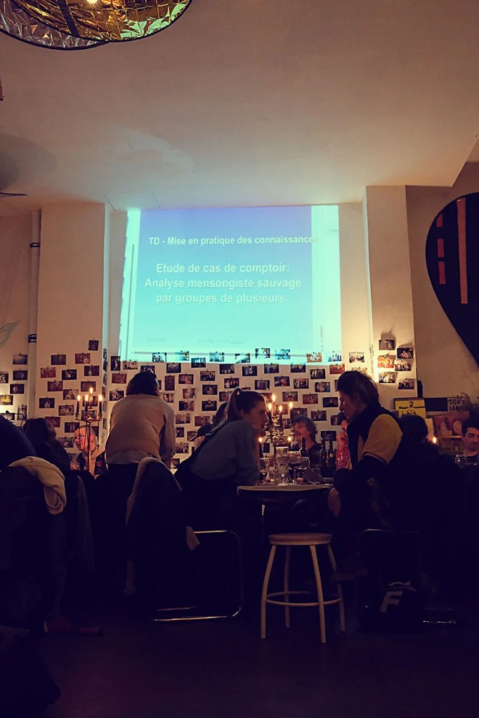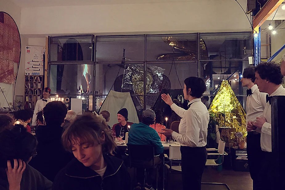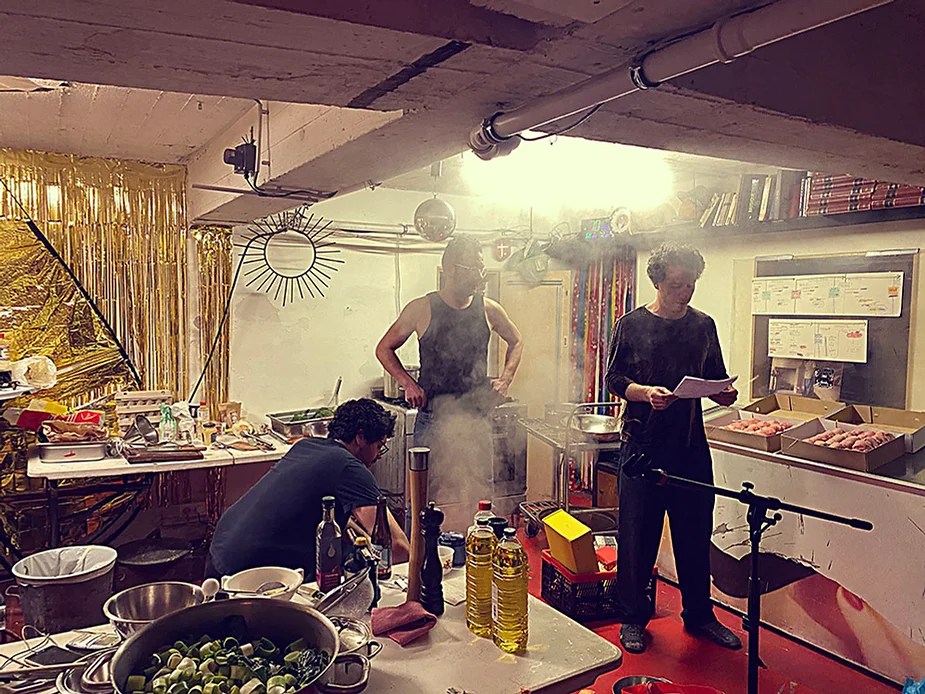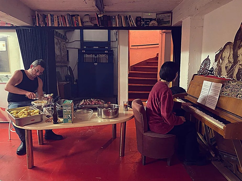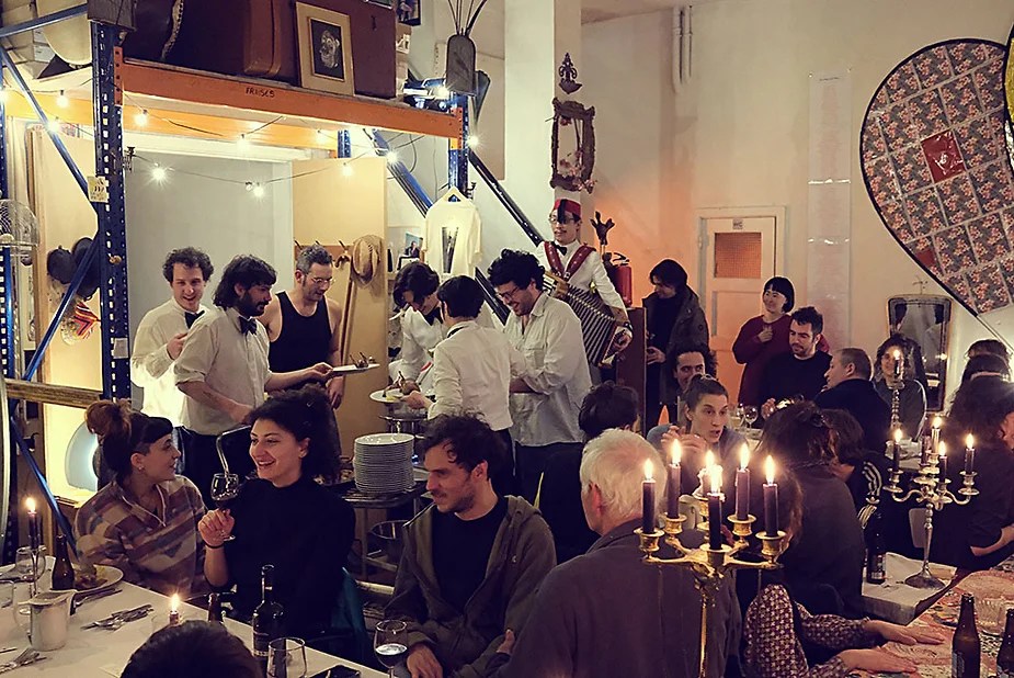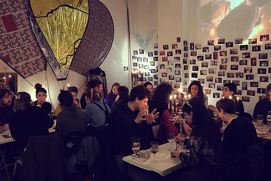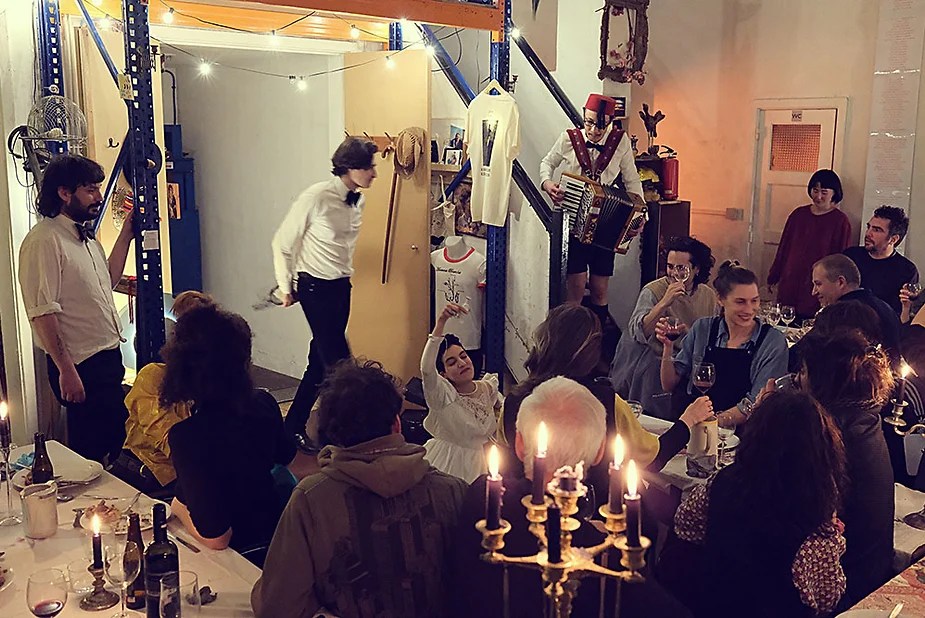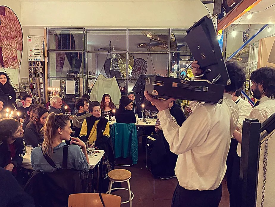 UN PEU de souvenirs d’un véritable mensonge avec l’ABONDANCE DES MYTHOS – présentée par le collectif bruxellois T(r)UELLE, au cours d’UN PEU FESTIVAL DE LA FIN DU MOIS – MARS – et lors de la cent septante septième des MILLE et UNE TERRASSE. C’était le VENDREDI SAINT. Le collectif T(r)uelle avait imaginé un banquet pour trente-trois couverts dans le CENTRE DE BEAUTE CULTURELLE UN PEU. La réception était composée de Quatre serveurs vêtus d’une chemise blanche et d’ un nœud papillon. Parmi eux il y avait les poètes comédiens, âgés d’ une trentaine d’ années : ALEX GUILLAUME, CLEMENT DELHOMME, MANON LAIGLE et ADRIANO LINZARINI. La cuisine était conduite par deux chefs Cuistots : l’éditeur underground Bichel et l’essayiste Edwin. Ils avaient alors investi la Terrasse sous terraine de façon à y élaborer leur menu en cinq services. Les haut-parleurs et la table de mixage de l’auditorium HD venaient de laisser la place à un grand frigidaire, une cuisinière au gaz, ainsi qu’un four. Le mobilier avait été déménagé, seul le grand sofa rouge était resté, mis à la disposition de la photographe Cayo van Breugel. Au cours du banquet elle invitera douze sujets en cuisine pour une séance de nu photographique. Enfin, il y avait la voisine qui était venue répéter son répertoire de musique classique sur le piano angélique. La musicienne japonaise jouait du Jean Sébastien Bach, tournant son dos à un régiment de trente-trois cailles qu’un couteau bien aiguisé venait d’en découper délicatement les têtes. A l’étage, dans la Terrasse intérieure, huit grandes tables formaient un E majuscule. Il y avait été dressée avec grand soin, tout un service orné. Des cartons nominatifs indiquaient la place respective de chaque convive. Tout ces effets avaient été méticuleusement Préparés de manière à faire croire aux hôtes – à la vérité de leurs mensonges, dans le plus étoilé des restaurants du royaume. Une heure avant le début du banquet, les deux chefs cuistots faisaient démarrer les fourneaux. La bataille des cuisiniers allait bientôt commencer, exactement quand une épaisse fumée de cuisson remplissait la Terrasse sous terraine … un peu trop abondamment. Aurait il été possible qu’un cumulus du huitième ciel de l’au de là, eût trouvé un passage dans ce cuisinage underground ? Les casseroles devenaient soudainement magiques, Edwin préparait une purée imprévue avec le moulin à purée de son grand-père. Bichel assurait l’artillerie lourde de sa batterie de couteaux. A l’ étage, les serveurs Alex Guillaume et Clément Delhomme accueillaient les trente trois convives de leurs boniments. Il était 19h30 au moment où Manon LAIGLE, serveuse de vérités, annonçait le premier acte : DES RAVIOLIS au fromage. Réalisée sur place, la pâte avait été colorée dans du jus de betteraves. Les plats étaient amenés à l’aide du monte-charge bleu. . Un peu plus tard, celui-ci remontait également Matthieu Ha, entrain de jouer de l’accordéon durant la lecture poétique d’Alex Guillaume, assis sur les marches de l’escalier menant à la mezzanine. Ensuite MANON LAIGLE annonçait le deuxième acte : UN BOUILLON COQUES fait à partir de petits coquillages. Pendant cette dégustation, ADRIANO LANZIRINI présentait une conférence de « mythocryptologie ». Il disposait de CLEMENT DELHOMME comme sujet d’étude. Une conférence appuyée d’une analyse par vidéo projection, allait démasquer la timidité joviale du poète bruxellois, non sans trait d’humour et sur le ton de la plaisanterie. Dehors, à l’entrée du Boulevard d’Ypres, la police avait installé un dispositif pour luter contre l’ Ubérisation des drogues. Pendant ce temps, les effets du vin rouge commençaient à désinhiber peu à peu les invités. Dès lors, Cayo van Breugel trouvait la bonne formule pour accéder à ses douze modèles de nus dont celui d’Alex Guillaume, lequel, après avoir « pausé » dans le monte-charge bleu, faisait une ascension par la plate forme du monte charge. Il apparaissait devant les invités, le corps dénudé et la tête ensanglantée. Puis il s’enfonçait dans le sol… Quatre heures venaient de s’écouler à la minuterie de la cuisinière. La voisine jouait en pleine transe du Debussy au piano, Bichel redoublait d’effort et mettait la sauce quand Edwin était toujours sur la préparation de sa purée imprévisible et dont le maniement du moulin à pomme de terre s’apparentait au fil du temps, à un moulin à prière. Manon Laigle annonçait le troisième plat « Acte 3: SAUCE EXPRESSE« . A l’issue de ce troisième acte, ADRIANO LANZIRINI et MANON LAIGLE, rejoint par Alex Guillaume et Clément Delhomme se prêteront à une séance de CRAPULOMANCIE. Celle-ci consistait à choisir une femme parmi les hôtes et de la prendre au dépourvue en la déclarant mariée avec elle-même. Au moment où les « crapulomenteurs” criaient “vive la marié”, le plat consistant arrivait par le Monte charge Bleu. Une gig celtique jouée à l’accordéon était reprise en rythme par les convives qui battaient la mesure sur la table avec leurs poings. Les deux chefs cuistots étaient venus rejoindre les serveurs pour mettre dans les assiettes – la fameuse (et finalement) onctueuse “Meta purée » d’Edwin, à coté des délicieuses Cailles cuisinées par Bichel. Le ventre presque abondamment rempli, la marié se levait sur une chaise. Sous sa robe de princesse romantique, elle lisait à voix haute les perspectives de son amour plein de sagesse. Pourtant au dernier paragraphe de sa longue déclaration d’amour, elle ne trouvait soudainement plus goût à elle même. Comme victime d’une cruelle schizophrénie, elle dédoublait sa passion amoureuse en un poison toxique qu’ elle absorbera cul sec et finira par la tuer. Dans une grande maitrise tragique, Matthieu Ha chantait une mélancolie, bri