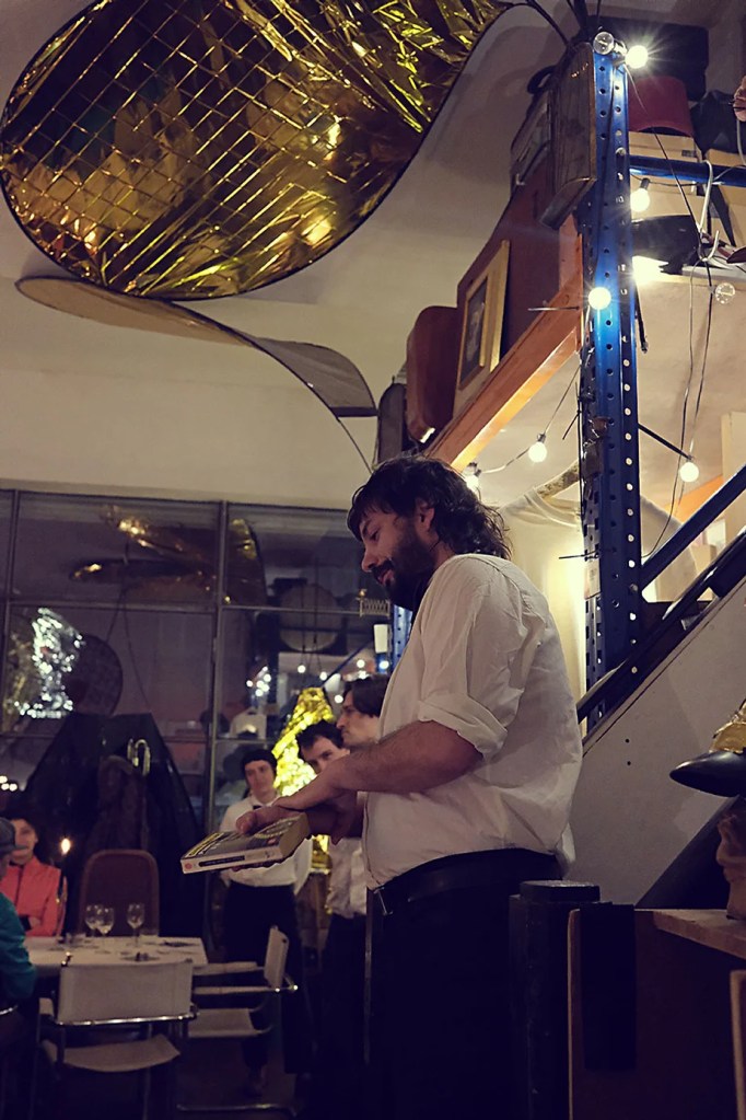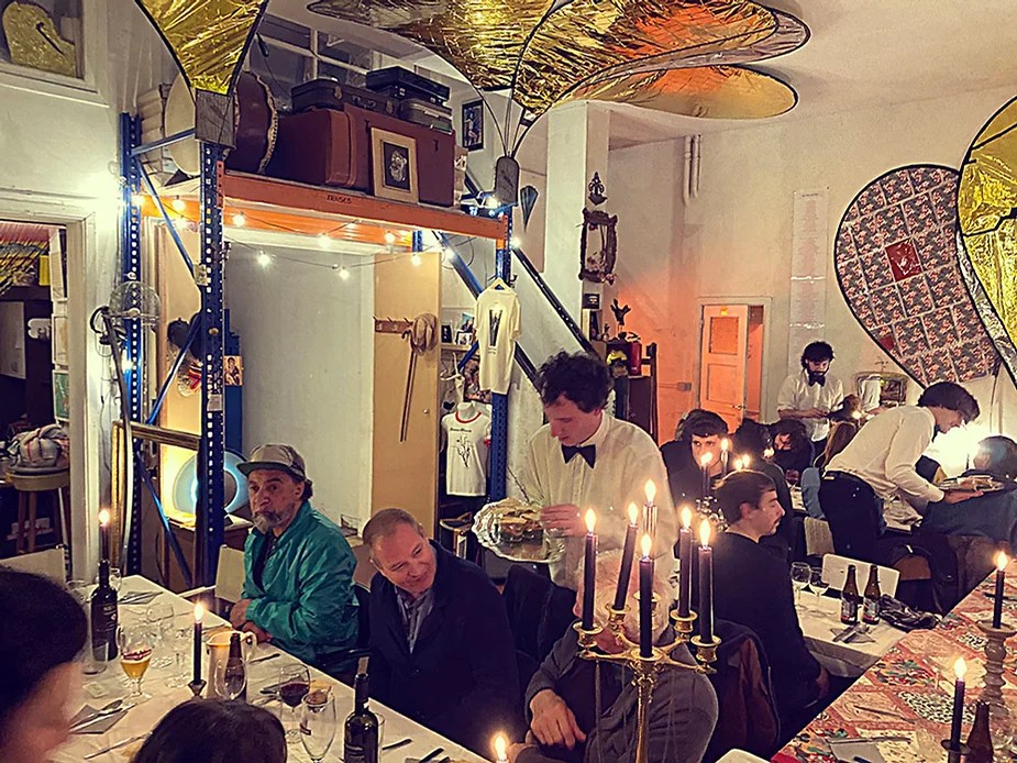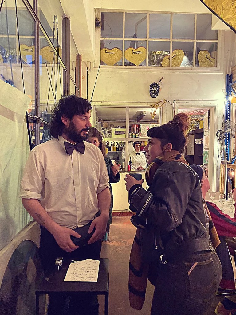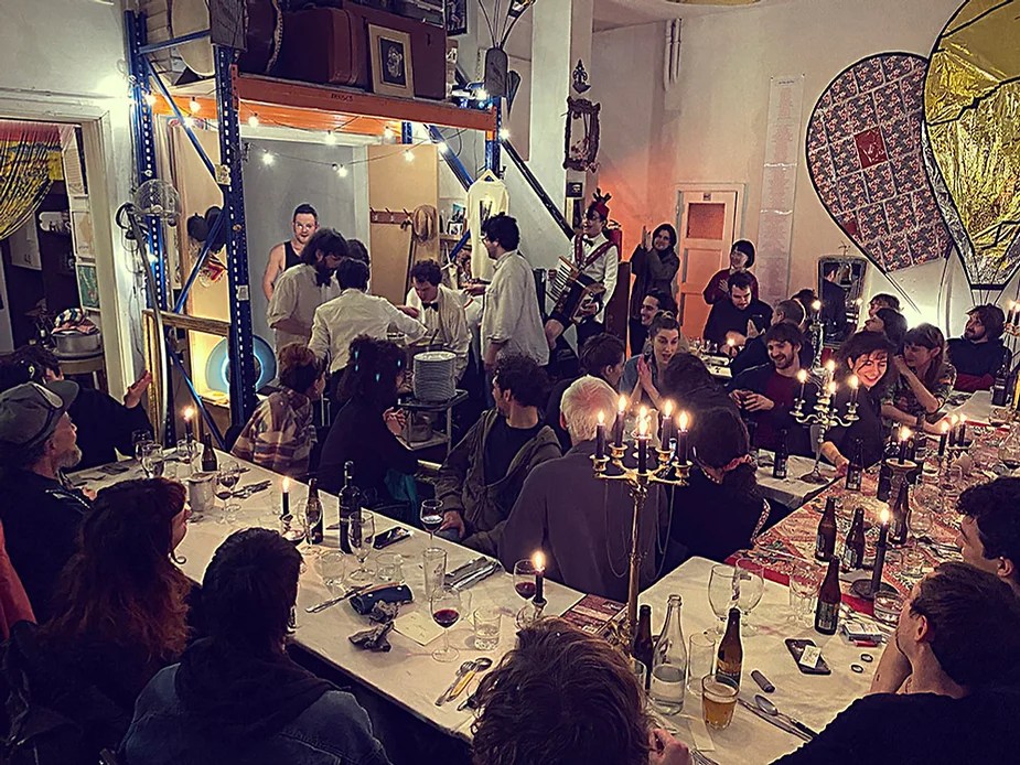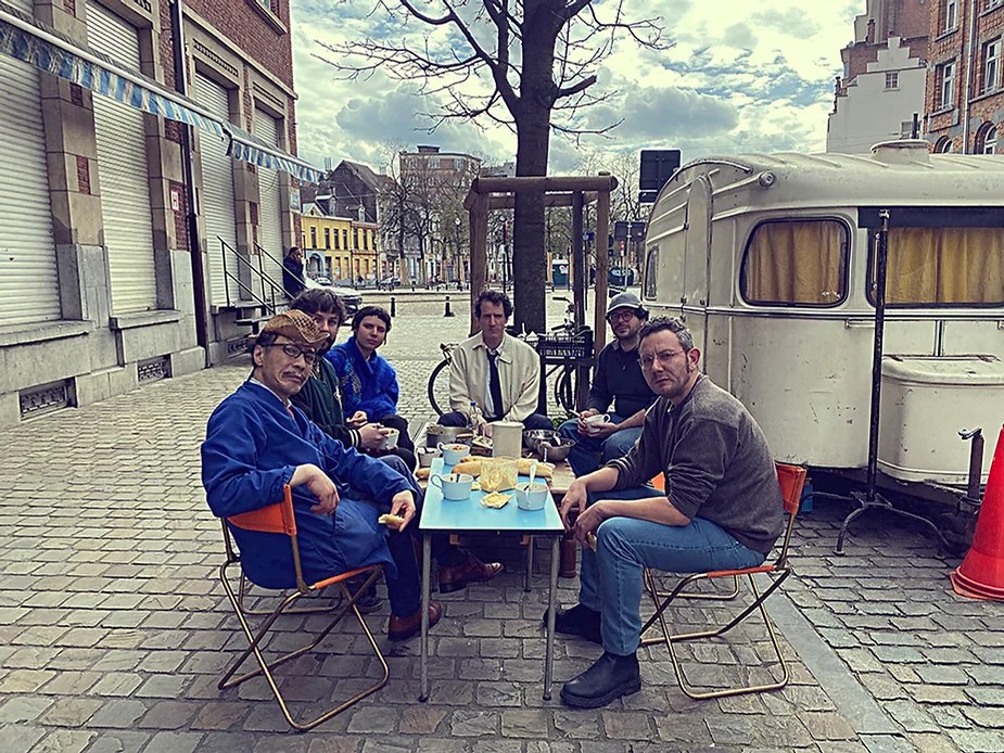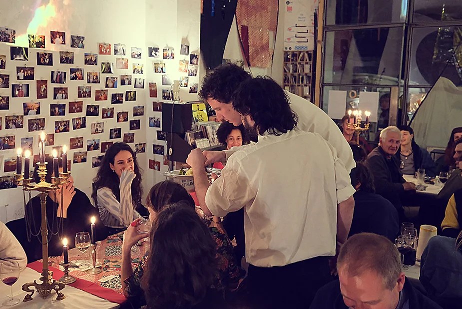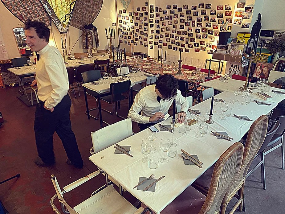 UN PEU de souvenirs d’un véritable mensonge avec l’ABONDANCE DES MYTHOS – présentée par le collectif bruxellois T(r)UELLE, au cours d’UN PEU FESTIVAL DE LA FIN DU MOIS – MARS – et lors de la cent septante septième des MILLE et UNE TERRASSE. C’était le VENDREDI SAINT. Le collectif T(r)uelle avait imaginé un banquet pour trente-trois couverts dans le CENTRE DE BEAUTE CULTURELLE UN PEU. La réception était composée de Quatre serveurs vêtus d’une chemise blanche et d’ un nœud papillon. Parmi eux il y avait les poètes comédiens, âgés d’ une trentaine d’ années : ALEX GUILLAUME, CLEMENT DELHOMME, MANON LAIGLE et ADRIANO LINZARINI. La cuisine était conduite par deux chefs Cuistots : l’éditeur underground Bichel et l’essayiste Edwin. Ils avaient alors investi la Terrasse sous terraine de façon à y élaborer leur menu en cinq services. Les haut-parleurs et la table de mixage de l’auditorium HD venaient de laisser la place à un grand frigidaire, une cuisinière au gaz, ainsi qu’un four. Le mobilier avait été déménagé, seul le grand sofa rouge était resté, mis à la disposition de la photographe Cayo van Breugel. Au cours du banquet elle invitera douze sujets en cuisine pour une séance de nu photographique. Enfin, il y avait la voisine qui était venue répéter son répertoire de musique classique sur le piano angélique. La musicienne japonaise jouait du Jean Sébastien Bach, tournant son dos à un régiment de trente-trois cailles qu’un couteau bien aiguisé venait d’en découper délicatement les têtes. A l’étage, dans la Terrasse intérieure, huit grandes tables formaient un E majuscule. Il y avait été dressée avec grand soin, tout un service orné. Des cartons nominatifs indiquaient la place respective de chaque convive. Tout ces effets avaient été méticuleusement Préparés de manière à faire croire aux hôtes – à la vérité de leurs mensonges, dans le plus étoilé des restaurants du royaume. Une heure avant le début du banquet, les deux chefs cuistots faisaient démarrer les fourneaux. La bataille des cuisiniers allait bientôt commencer, exactement quand une épaisse fumée de cuisson remplissait la Terrasse sous terraine … un peu trop abondamment. Aurait il été possible qu’un cumulus du huitième ciel de l’au de là, eût trouvé un passage dans ce cuisinage underground ? Les casseroles devenaient soudainement magiques, Edwin préparait une purée imprévue avec le moulin à purée de son grand-père. Bichel assurait l’artillerie lourde de sa batterie de couteaux. A l’ étage, les serveurs Alex Guillaume et Clément Delhomme accueillaient les trente trois convives de leurs boniments. Il était 19h30 au moment où Manon LAIGLE, serveuse de vérités, annonçait le premier acte : DES RAVIOLIS au fromage. Réalisée sur place, la pâte avait été colorée dans du jus de betteraves. Les plats étaient amenés à l’aide du monte-charge bleu. . Un peu plus tard, celui-ci remontait également Matthieu Ha, entrain de jouer de l’accordéon durant la lecture poétique d’Alex Guillaume, assis sur les marches de l’escalier menant à la mezzanine. Ensuite MANON LAIGLE annonçait le deuxième acte : UN BOUILLON COQUES fait à partir de petits coquillages. Pendant cette dégustation, ADRIANO LANZIRINI présentait une conférence de « mythocryptologie ». Il disposait de CLEMENT DELHOMME comme sujet d’étude. Une conférence appuyée d’une analyse par vidéo projection, allait démasquer la timidité joviale du poète bruxellois, non sans trait d’humour et sur le ton de la plaisanterie. Dehors, à l’entrée du Boulevard d’Ypres, la police avait installé un dispositif pour luter contre l’ Ubérisation des drogues. Pendant ce temps, les effets du vin rouge commençaient à désinhiber peu à peu les invités. Dès lors, Cayo van Breugel trouvait la bonne formule pour accéder à ses douze modèles de nus dont celui d’Alex Guillaume, lequel, après avoir « pausé » dans le monte-charge bleu, faisait une ascension par la plate forme du monte charge. Il apparaissait devant les invités, le corps dénudé et la tête ensanglantée. Puis il s’enfonçait dans le sol… Quatre heures venaient de s’écouler à la minuterie de la cuisinière. La voisine jouait en pleine transe du Debussy au piano, Bichel redoublait d’effort et mettait la sauce quand Edwin était toujours sur la préparation de sa purée imprévisible et dont le maniement du moulin à pomme de terre s’apparentait au fil du temps, à un moulin à prière. Manon Laigle annonçait le troisième plat « Acte 3: SAUCE EXPRESSE« . A l’issue de ce troisième acte, ADRIANO LANZIRINI et MANON LAIGLE, rejoint par Alex Guillaume et Clément Delhomme se prêteront à une séance de CRAPULOMANCIE. Celle-ci consistait à choisir une femme parmi les hôtes et de la prendre au dépourvue en la déclarant mariée avec elle-même. Au moment où les « crapulomenteurs” criaient “vive la marié”, le plat consistant arrivait par le Monte charge Bleu. Une gig celtique jouée à l’accordéon était reprise en rythme par les convives qui battaient la mesure sur la table avec leurs poings. Les deux chefs cuistots étaient venus rejoindre les serveurs pour mettre dans les assiettes – la fameuse (et finalement) onctueuse “Meta purée » d’Edwin, à coté des délicieuses Cailles cuisinées par Bichel. Le ventre presque abondamment rempli, la marié se levait sur une chaise. Sous sa robe de princesse romantique, elle lisait à voix haute les perspectives de son amour plein de sagesse. Pourtant au dernier paragraphe de sa longue déclaration d’amour, elle ne trouvait soudainement plus goût à elle même. Comme victime d’une cruelle schizophrénie, elle dédoublait sa passion amoureuse en un poison toxique qu’ elle absorbera cul sec et finira par la tuer. Dans une grande maitrise tragique, Matthieu Ha chantait une mélancolie, bri