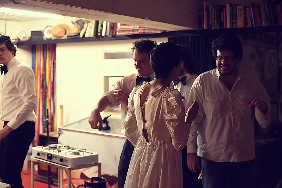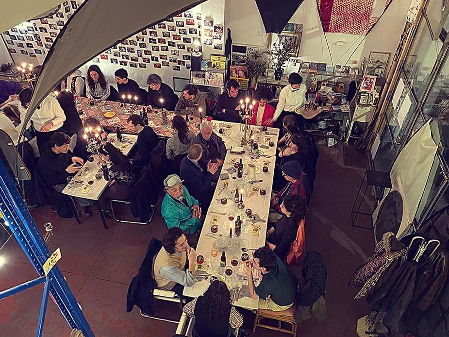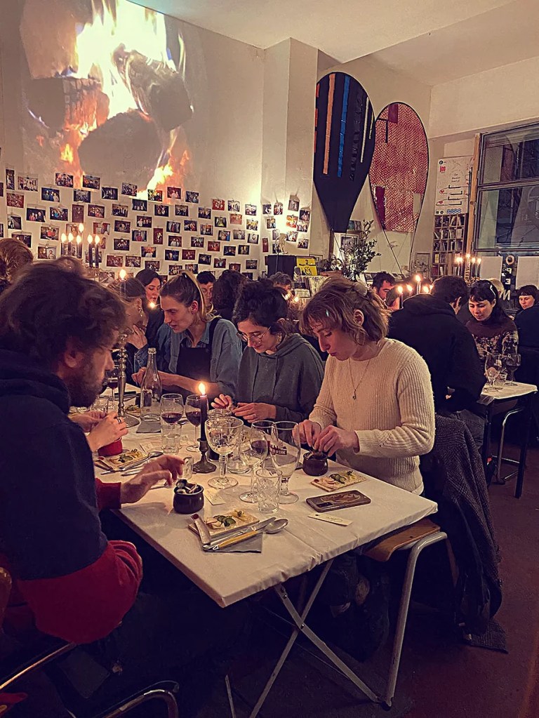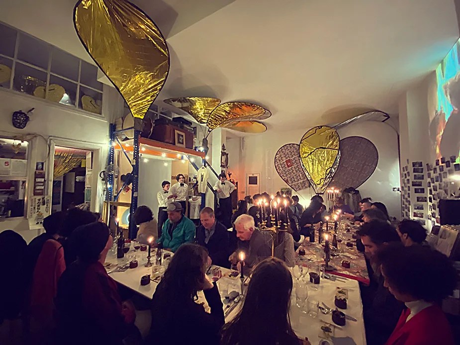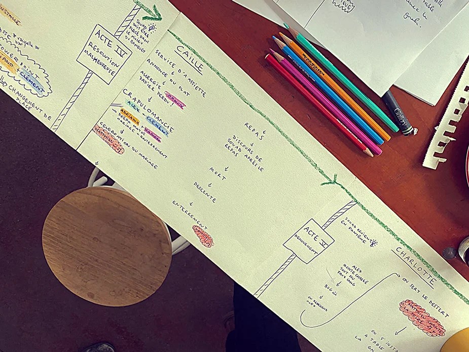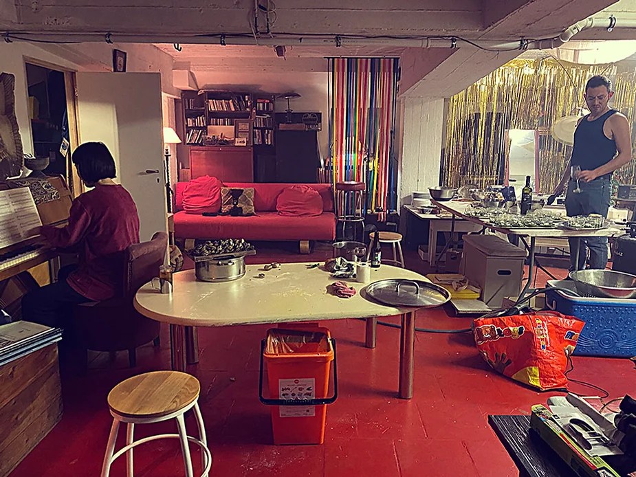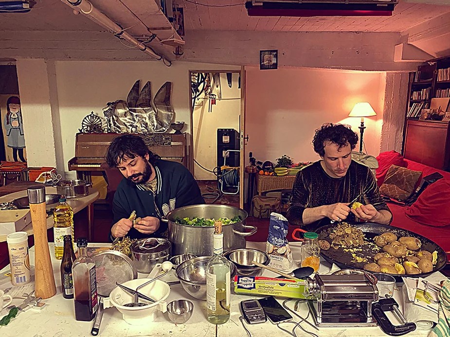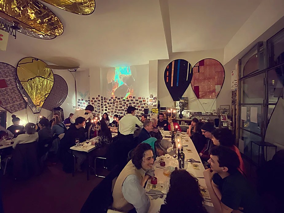 UN PEU de souvenirs d’un véritable mensonge avec l’ABONDANCE DES MYTHOS – présentée par le collectif bruxellois T(r)UELLE, au cours d’UN PEU FESTIVAL DE LA FIN DU MOIS – MARS – et lors de la cent septante septième des MILLE et UNE TERRASSE. C’était le VENDREDI SAINT. Le collectif T(r)uelle avait imaginé un banquet pour trente-trois couverts dans le CENTRE DE BEAUTE CULTURELLE UN PEU. La réception était composée de Quatre serveurs vêtus d’une chemise blanche et d’ un nœud papillon. Parmi eux il y avait les poètes comédiens, âgés d’ une trentaine d’ années : ALEX GUILLAUME, CLEMENT DELHOMME, MANON LAIGLE et ADRIANO LINZARINI. La cuisine était conduite par deux chefs Cuistots : l’éditeur underground Bichel et l’essayiste Edwin. Ils avaient alors investi la Terrasse sous terraine de façon à y élaborer leur menu en cinq services. Les haut-parleurs et la table de mixage de l’auditorium HD venaient de laisser la place à un grand frigidaire, une cuisinière au gaz, ainsi qu’un four. Le mobilier avait été déménagé, seul le grand sofa rouge était resté, mis à la disposition de la photographe Cayo van Breugel. Au cours du banquet elle invitera douze sujets en cuisine pour une séance de nu photographique. Enfin, il y avait la voisine qui était venue répéter son répertoire de musique classique sur le piano angélique. La musicienne japonaise jouait du Jean Sébastien Bach, tournant son dos à un régiment de trente-trois cailles qu’un couteau bien aiguisé venait d’en découper délicatement les têtes. A l’étage, dans la Terrasse intérieure, huit grandes tables formaient un E majuscule. Il y avait été dressée avec grand soin, tout un service orné. Des cartons nominatifs indiquaient la place respective de chaque convive. Tout ces effets avaient été méticuleusement Préparés de manière à faire croire aux hôtes – à la vérité de leurs mensonges, dans le plus étoilé des restaurants du royaume. Une heure avant le début du banquet, les deux chefs cuistots faisaient démarrer les fourneaux. La bataille des cuisiniers allait bientôt commencer, exactement quand une épaisse fumée de cuisson remplissait la Terrasse sous terraine … un peu trop abondamment. Aurait il été possible qu’un cumulus du huitième ciel de l’au de là, eût trouvé un passage dans ce cuisinage underground ? Les casseroles devenaient soudainement magiques, Edwin préparait une purée imprévue avec le moulin à purée de son grand-père. Bichel assurait l’artillerie lourde de sa batterie de couteaux. A l’ étage, les serveurs Alex Guillaume et Clément Delhomme accueillaient les trente trois convives de leurs boniments. Il était 19h30 au moment où Manon LAIGLE, serveuse de vérités, annonçait le premier acte : DES RAVIOLIS au fromage. Réalisée sur place, la pâte avait été colorée dans du jus de betteraves. Les plats étaient amenés à l’aide du monte-charge bleu. . Un peu plus tard, celui-ci remontait également Matthieu Ha, entrain de jouer de l’accordéon durant la lecture poétique d’Alex Guillaume, assis sur les marches de l’escalier menant à la mezzanine. Ensuite MANON LAIGLE annonçait le deuxième acte : UN BOUILLON COQUES fait à partir de petits coquillages. Pendant cette dégustation, ADRIANO LANZIRINI présentait une conférence de « mythocryptologie ». Il disposait de CLEMENT DELHOMME comme sujet d’étude. Une conférence appuyée d’une analyse par vidéo projection, allait démasquer la timidité joviale du poète bruxellois, non sans trait d’humour et sur le ton de la plaisanterie. Dehors, à l’entrée du Boulevard d’Ypres, la police avait installé un dispositif pour luter contre l’ Ubérisation des drogues. Pendant ce temps, les effets du vin rouge commençaient à désinhiber peu à peu les invités. Dès lors, Cayo van Breugel trouvait la bonne formule pour accéder à ses douze modèles de nus dont celui d’Alex Guillaume, lequel, après avoir « pausé » dans le monte-charge bleu, faisait une ascension par la plate forme du monte charge. Il apparaissait devant les invités, le corps dénudé et la tête ensanglantée. Puis il s’enfonçait dans le sol… Quatre heures venaient de s’écouler à la minuterie de la cuisinière. La voisine jouait en pleine transe du Debussy au piano, Bichel redoublait d’effort et mettait la sauce quand Edwin était toujours sur la préparation de sa purée imprévisible et dont le maniement du moulin à pomme de terre s’apparentait au fil du temps, à un moulin à prière. Manon Laigle annonçait le troisième plat « Acte 3: SAUCE EXPRESSE« . A l’issue de ce troisième acte, ADRIANO LANZIRINI et MANON LAIGLE, rejoint par Alex Guillaume et Clément Delhomme se prêteront à une séance de CRAPULOMANCIE. Celle-ci consistait à choisir une femme parmi les hôtes et de la prendre au dépourvue en la déclarant mariée avec elle-même. Au moment où les « crapulomenteurs” criaient “vive la marié”, le plat consistant arrivait par le Monte charge Bleu. Une gig celtique jouée à l’accordéon était reprise en rythme par les convives qui battaient la mesure sur la table avec leurs poings. Les deux chefs cuistots étaient venus rejoindre les serveurs pour mettre dans les assiettes – la fameuse (et finalement) onctueuse “Meta purée » d’Edwin, à coté des délicieuses Cailles cuisinées par Bichel. Le ventre presque abondamment rempli, la marié se levait sur une chaise. Sous sa robe de princesse romantique, elle lisait à voix haute les perspectives de son amour plein de sagesse. Pourtant au dernier paragraphe de sa longue déclaration d’amour, elle ne trouvait soudainement plus goût à elle même. Comme victime d’une cruelle schizophrénie, elle dédoublait sa passion amoureuse en un poison toxique qu’ elle absorbera cul sec et finira par la tuer. Dans une grande maitrise tragique, Matthieu Ha chantait une mélancolie, bri