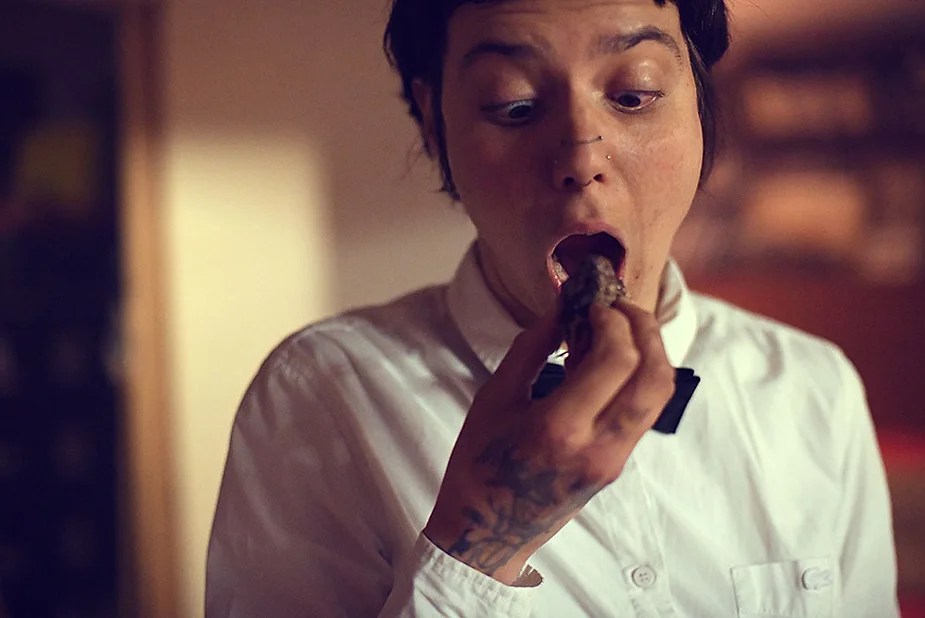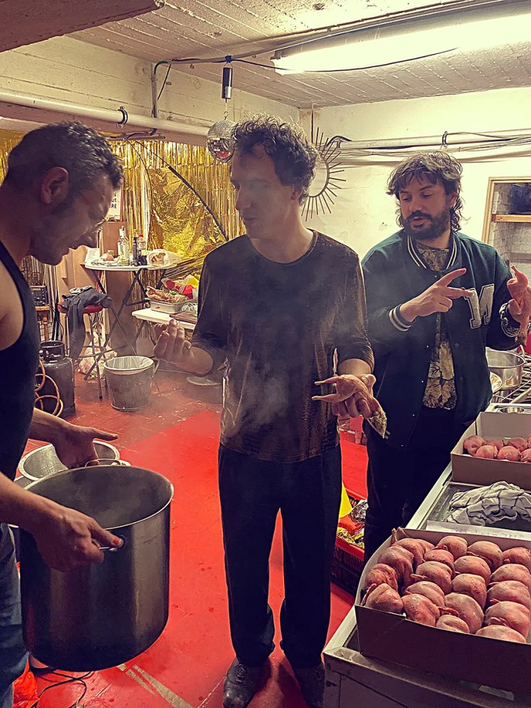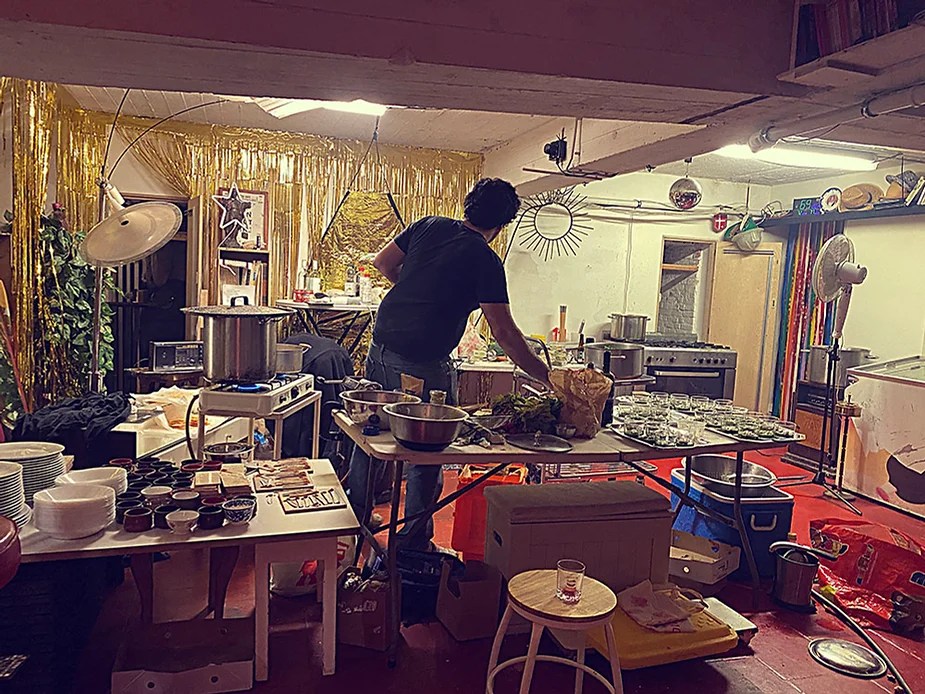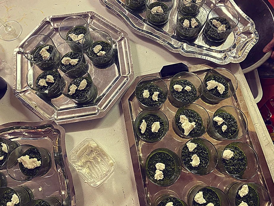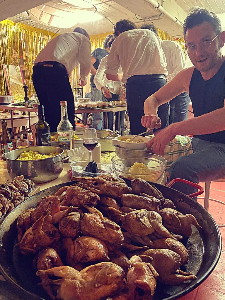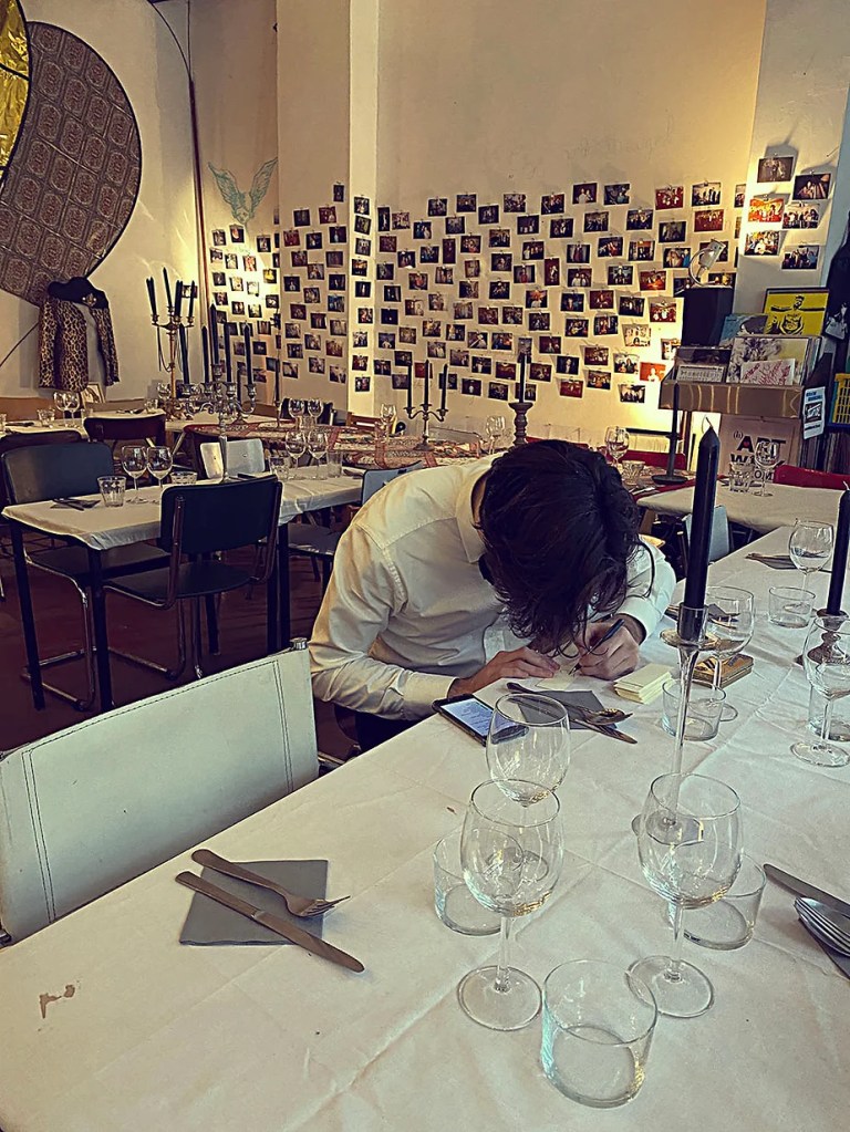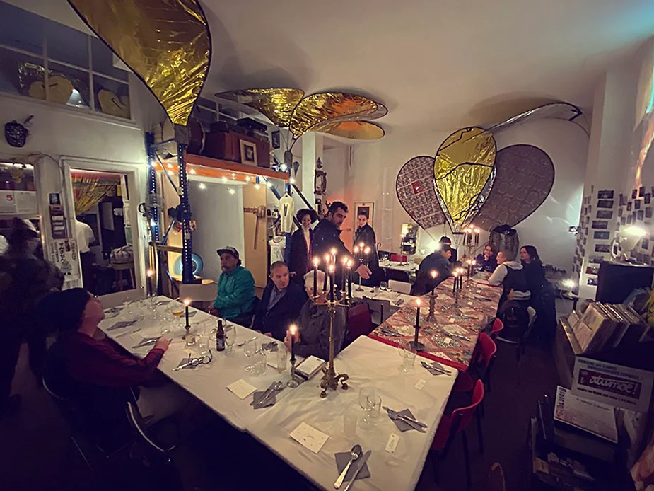 UN PEU de souvenirs d’un véritable mensonge avec l’ABONDANCE DES MYTHOS – présentée par le collectif bruxellois T(r)UELLE, au cours d’UN PEU FESTIVAL DE LA FIN DU MOIS – MARS – et lors de la cent septante septième des MILLE et UNE TERRASSE. C’était le VENDREDI SAINT. Le collectif T(r)uelle avait imaginé un banquet pour trente-trois couverts dans le CENTRE DE BEAUTE CULTURELLE UN PEU. La réception était composée de Quatre serveurs vêtus d’une chemise blanche et d’ un nœud papillon. Parmi eux il y avait les poètes comédiens, âgés d’ une trentaine d’ années : ALEX GUILLAUME, CLEMENT DELHOMME, MANON LAIGLE et ADRIANO LINZARINI. La cuisine était conduite par deux chefs Cuistots : l’éditeur underground Bichel et l’essayiste Edwin. Ils avaient alors investi la Terrasse sous terraine de façon à y élaborer leur menu en cinq services. Les haut-parleurs et la table de mixage de l’auditorium HD venaient de laisser la place à un grand frigidaire, une cuisinière au gaz, ainsi qu’un four. Le mobilier avait été déménagé, seul le grand sofa rouge était resté, mis à la disposition de la photographe Cayo van Breugel. Au cours du banquet elle invitera douze sujets en cuisine pour une séance de nu photographique. Enfin, il y avait la voisine qui était venue répéter son répertoire de musique classique sur le piano angélique. La musicienne japonaise jouait du Jean Sébastien Bach, tournant son dos à un régiment de trente-trois cailles qu’un couteau bien aiguisé venait d’en découper délicatement les têtes. A l’étage, dans la Terrasse intérieure, huit grandes tables formaient un E majuscule. Il y avait été dressée avec grand soin, tout un service orné. Des cartons nominatifs indiquaient la place respective de chaque convive. Tout ces effets avaient été méticuleusement Préparés de manière à faire croire aux hôtes – à la vérité de leurs mensonges, dans le plus étoilé des restaurants du royaume. Une heure avant le début du banquet, les deux chefs cuistots faisaient démarrer les fourneaux. La bataille des cuisiniers allait bientôt commencer, exactement quand une épaisse fumée de cuisson remplissait la Terrasse sous terraine … un peu trop abondamment. Aurait il été possible qu’un cumulus du huitième ciel de l’au de là, eût trouvé un passage dans ce cuisinage underground ? Les casseroles devenaient soudainement magiques, Edwin préparait une purée imprévue avec le moulin à purée de son grand-père. Bichel assurait l’artillerie lourde de sa batterie de couteaux. A l’ étage, les serveurs Alex Guillaume et Clément Delhomme accueillaient les trente trois convives de leurs boniments. Il était 19h30 au moment où Manon LAIGLE, serveuse de vérités, annonçait le premier acte : DES RAVIOLIS au fromage. Réalisée sur place, la pâte avait été colorée dans du jus de betteraves. Les plats étaient amenés à l’aide du monte-charge bleu. . Un peu plus tard, celui-ci remontait également Matthieu Ha, entrain de jouer de l’accordéon durant la lecture poétique d’Alex Guillaume, assis sur les marches de l’escalier menant à la mezzanine. Ensuite MANON LAIGLE annonçait le deuxième acte : UN BOUILLON COQUES fait à partir de petits coquillages. Pendant cette dégustation, ADRIANO LANZIRINI présentait une conférence de « mythocryptologie ». Il disposait de CLEMENT DELHOMME comme sujet d’étude. Une conférence appuyée d’une analyse par vidéo projection, allait démasquer la timidité joviale du poète bruxellois, non sans trait d’humour et sur le ton de la plaisanterie. Dehors, à l’entrée du Boulevard d’Ypres, la police avait installé un dispositif pour luter contre l’ Ubérisation des drogues. Pendant ce temps, les effets du vin rouge commençaient à désinhiber peu à peu les invités. Dès lors, Cayo van Breugel trouvait la bonne formule pour accéder à ses douze modèles de nus dont celui d’Alex Guillaume, lequel, après avoir « pausé » dans le monte-charge bleu, faisait une ascension par la plate forme du monte charge. Il apparaissait devant les invités, le corps dénudé et la tête ensanglantée. Puis il s’enfonçait dans le sol… Quatre heures venaient de s’écouler à la minuterie de la cuisinière. La voisine jouait en pleine transe du Debussy au piano, Bichel redoublait d’effort et mettait la sauce quand Edwin était toujours sur la préparation de sa purée imprévisible et dont le maniement du moulin à pomme de terre s’apparentait au fil du temps, à un moulin à prière. Manon Laigle annonçait le troisième plat « Acte 3: SAUCE EXPRESSE« . A l’issue de ce troisième acte, ADRIANO LANZIRINI et MANON LAIGLE, rejoint par Alex Guillaume et Clément Delhomme se prêteront à une séance de CRAPULOMANCIE. Celle-ci consistait à choisir une femme parmi les hôtes et de la prendre au dépourvue en la déclarant mariée avec elle-même. Au moment où les « crapulomenteurs” criaient “vive la marié”, le plat consistant arrivait par le Monte charge Bleu. Une gig celtique jouée à l’accordéon était reprise en rythme par les convives qui battaient la mesure sur la table avec leurs poings. Les deux chefs cuistots étaient venus rejoindre les serveurs pour mettre dans les assiettes – la fameuse (et finalement) onctueuse “Meta purée » d’Edwin, à coté des délicieuses Cailles cuisinées par Bichel. Le ventre presque abondamment rempli, la marié se levait sur une chaise. Sous sa robe de princesse romantique, elle lisait à voix haute les perspectives de son amour plein de sagesse. Pourtant au dernier paragraphe de sa longue déclaration d’amour, elle ne trouvait soudainement plus goût à elle même. Comme victime d’une cruelle schizophrénie, elle dédoublait sa passion amoureuse en un poison toxique qu’ elle absorbera cul sec et finira par la tuer. Dans une grande maitrise tragique, Matthieu Ha chantait une mélancolie, bri